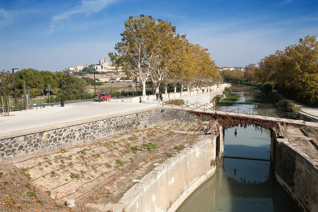 At the base of the locks you can either choose to continue along the canal towards Béziers , which is lined with an avenue of plane trees or turn right and explore the new garden area.