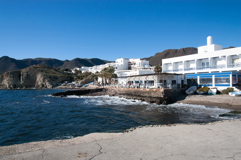 First stop La Isleta de Moro, a stone’s throw from our campsite. A short drive from the main coast road led us into this quaint and relatively unspoilt village of small white houses. There was a parking area overlooking the main beach, large enough for numerous motorhomes, which was sandy and looked ideal for bathing, but we followed the main road right down to the shore and luckily found a parking spot near the communal washing area.