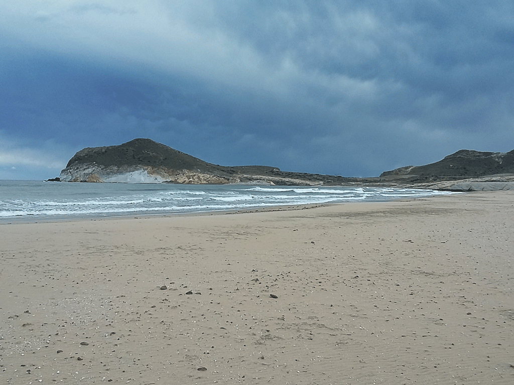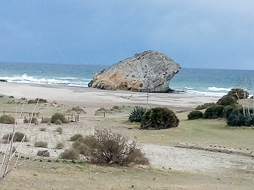 As you approach the Playa de Mónsul you cannot help but notice a huge rock formation in the middle of the beach, known as the petrified wave.