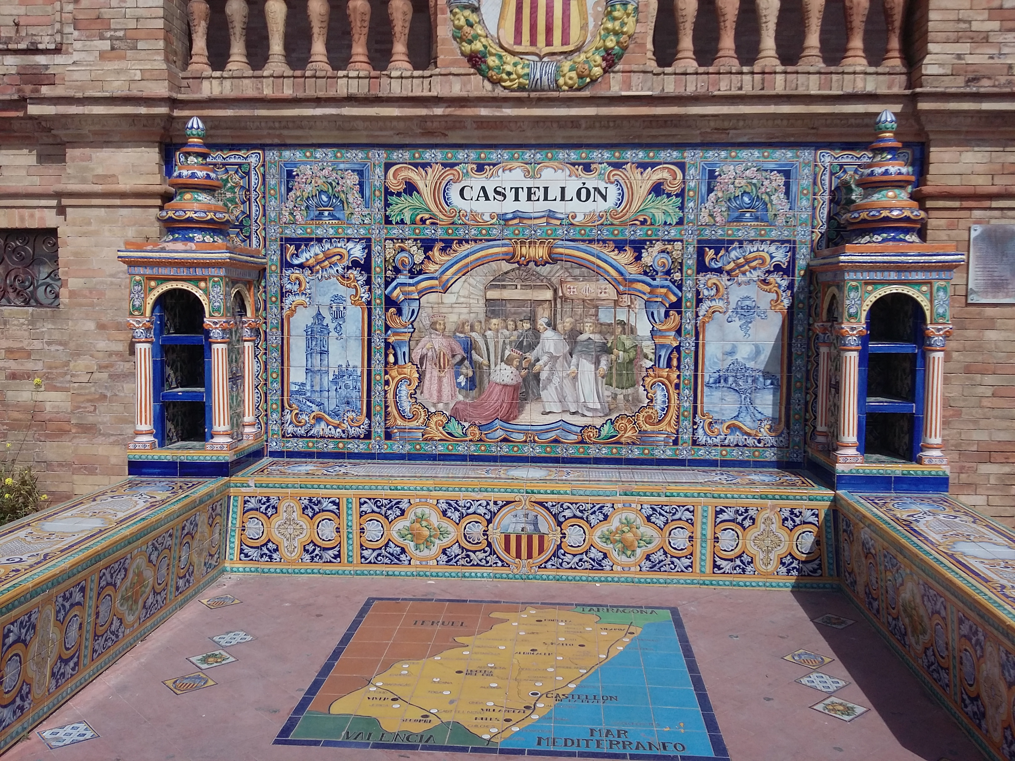 Around the inside of the semicircular arcade are tiled alcoves, each representing a different province of Spain.