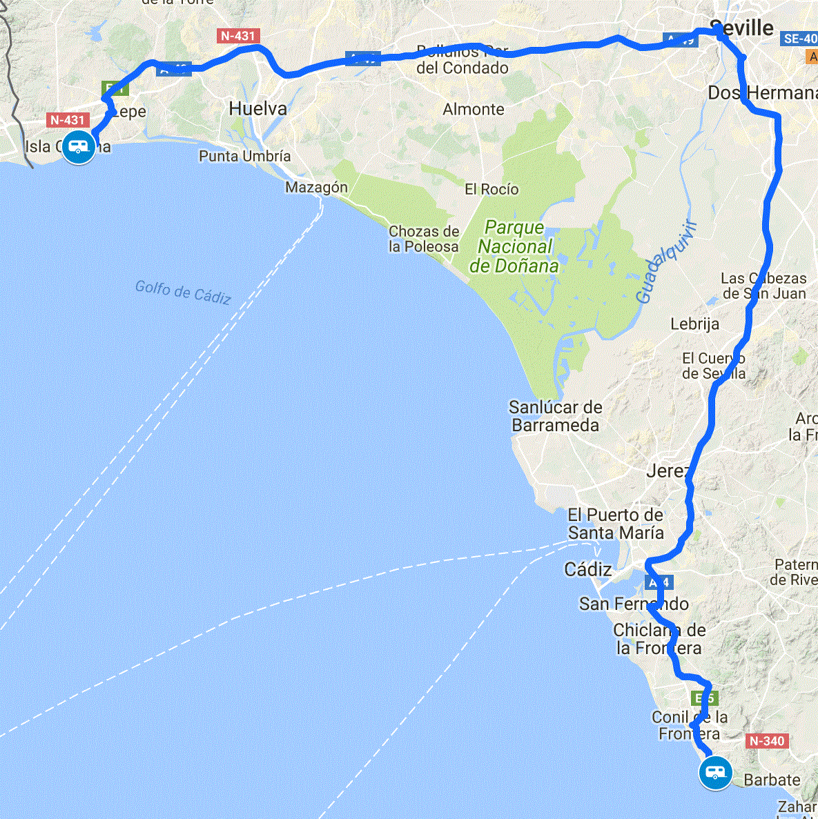 On Monday, although still feeling under the weather a little, we packed up and set off for our next site, Camping Giralda at Isla Cristina. This involved an incident free tow of 288km mostly on motorway with clear skies and ever increasing temperatures. We saw 28°C for a while.