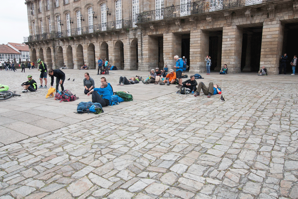 The pilgrims/hikers/bikers seem to sit in their groups outside the palace to recover from their efforts.