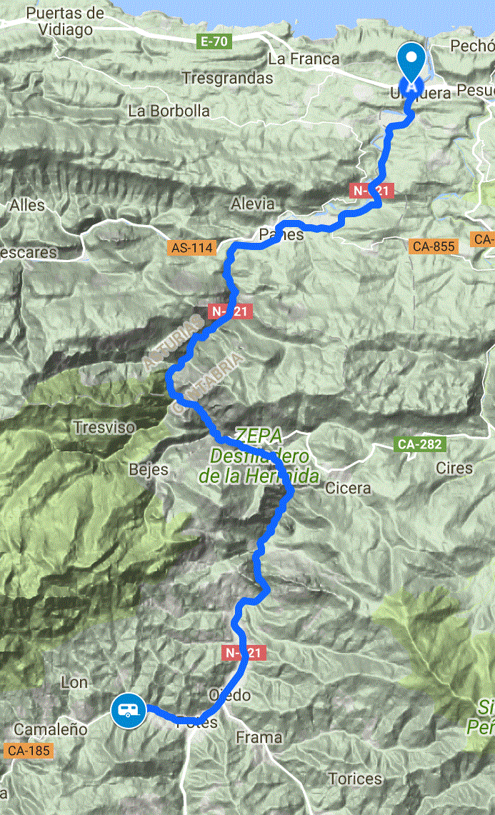 The journey on the A8 passed through marvellous scenery again but there were a distinct lack of places to refuel the car without leaving the motorway. This can sometimes be a pain with the caravan in tow. The journey progress changed markedly at the point we turned off of the motorway near Bustio onto the N621.