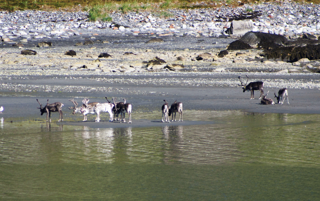 As we drove out of the Nordkapp tunnel we were greeted with the sight of a herd of reindeer in the water.