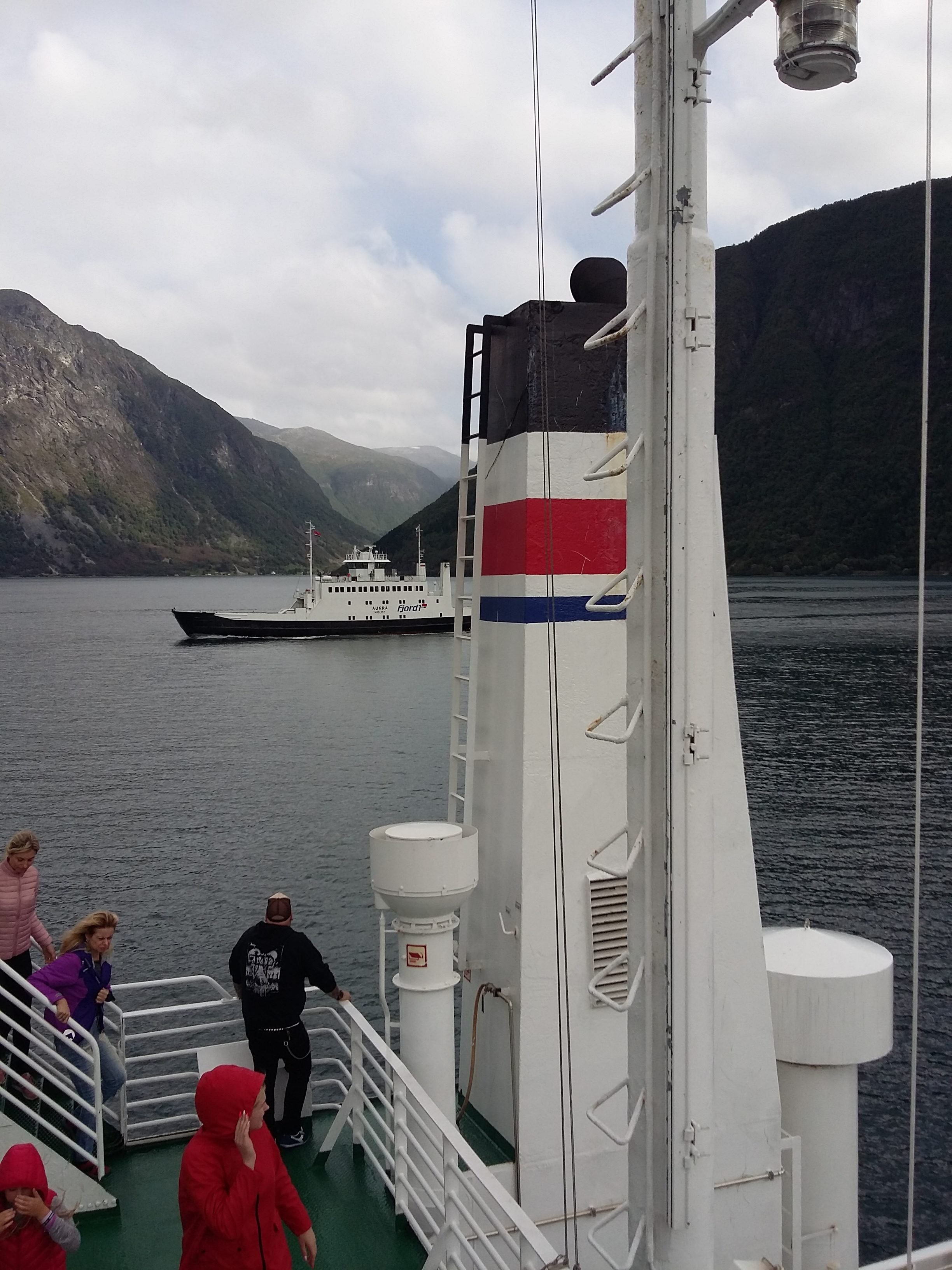 The road disappears into the fjord at Linge, so we joined the short queue for the ferry. The cost of the 12 minute ‘sailing’ over to Eidsdal was a rather shocking 357NOK and the loader took pity on us and charged for up to 10 metres long. We are nearer 13!
