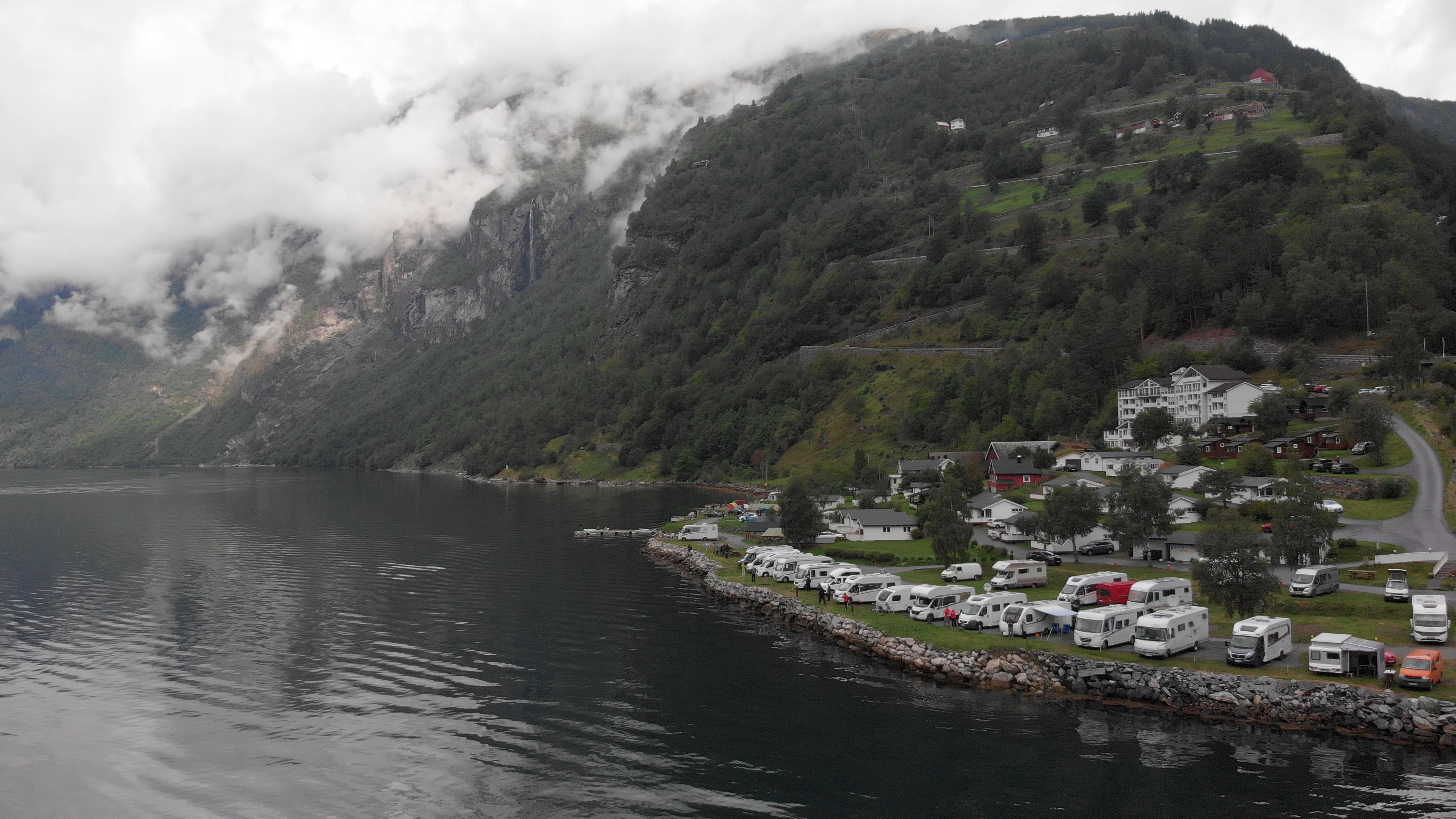 The impressive Eagle Road that descends 620 metres down to Geiranger was the next feature on this excellent route. The road has 11 hairpin bends and a superb viewpoint, Ørnesvingen, at the top hairpin. Unfortunately for us the area was rammed with tourist coaches and cars with nowhere for us to stop. We continued down to Geirangerfjorden Feriesenter where we were to stay 3 nights.