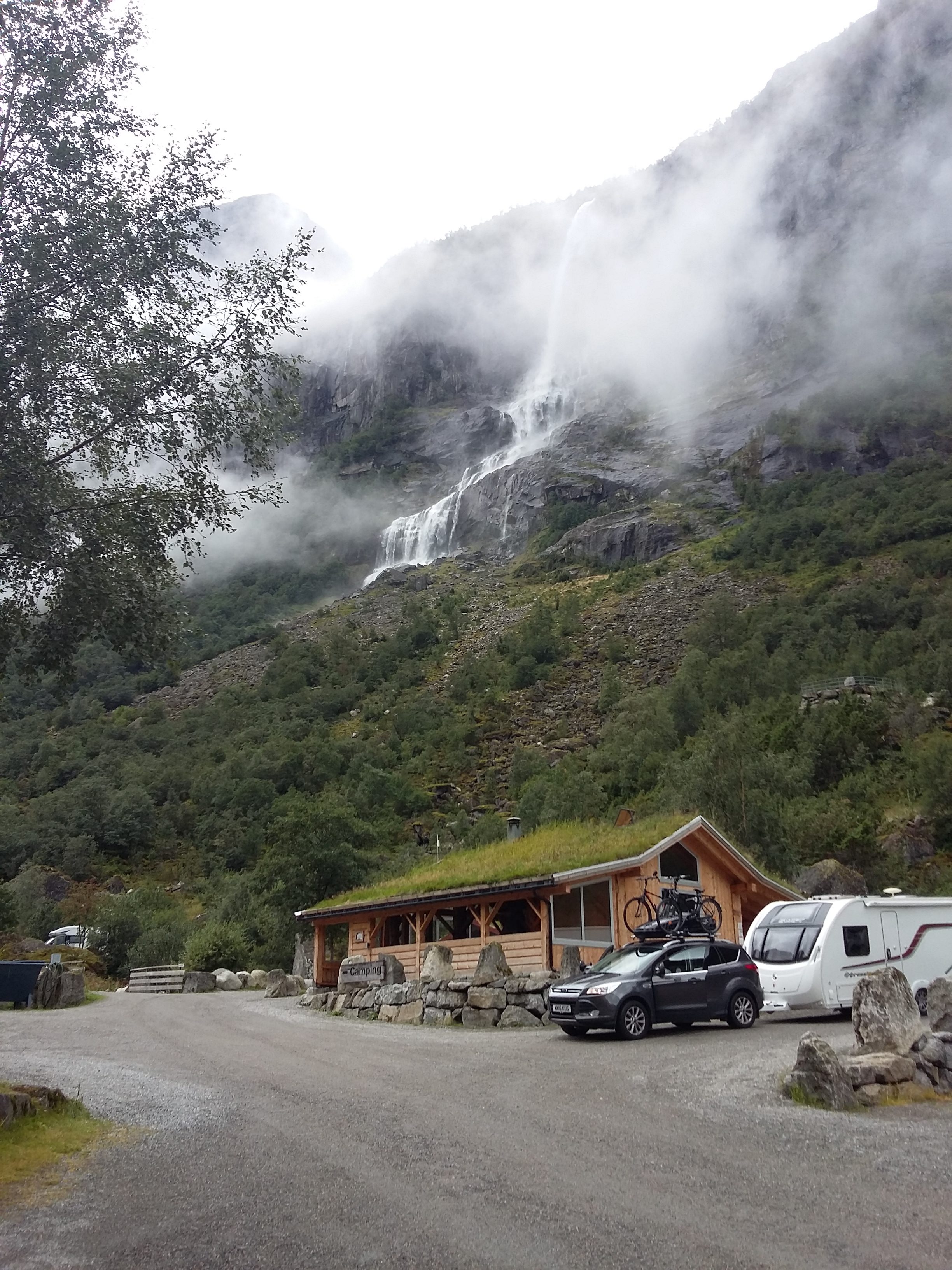 After a rather difficult, at times, 20km or so we arrived at the campsite. The pitches are on multiple levels set among grass roofed hyttes, and framed by mountains on three sides with glaciers and waterfalls. Fantastic. The facilities are excellent.