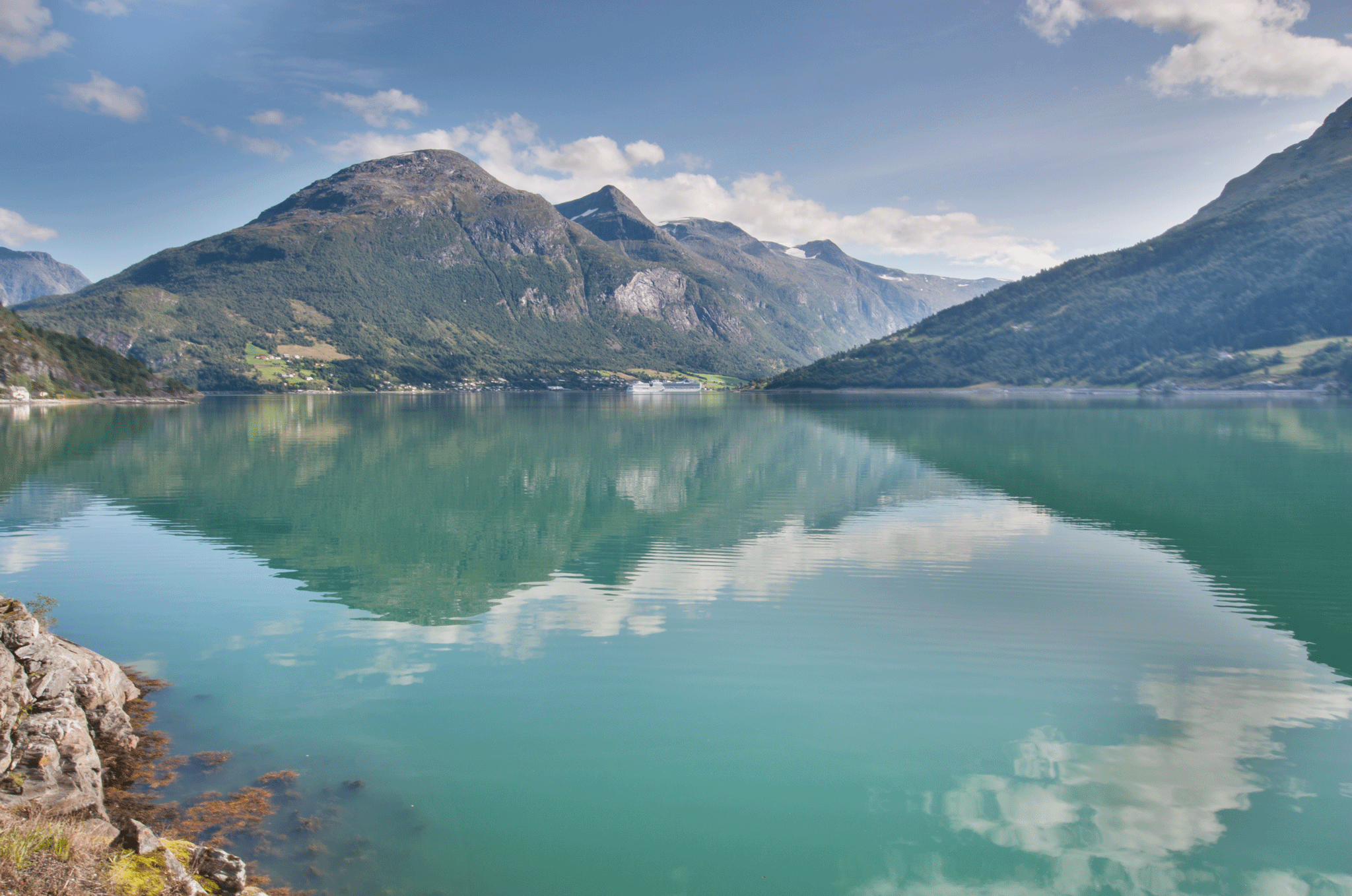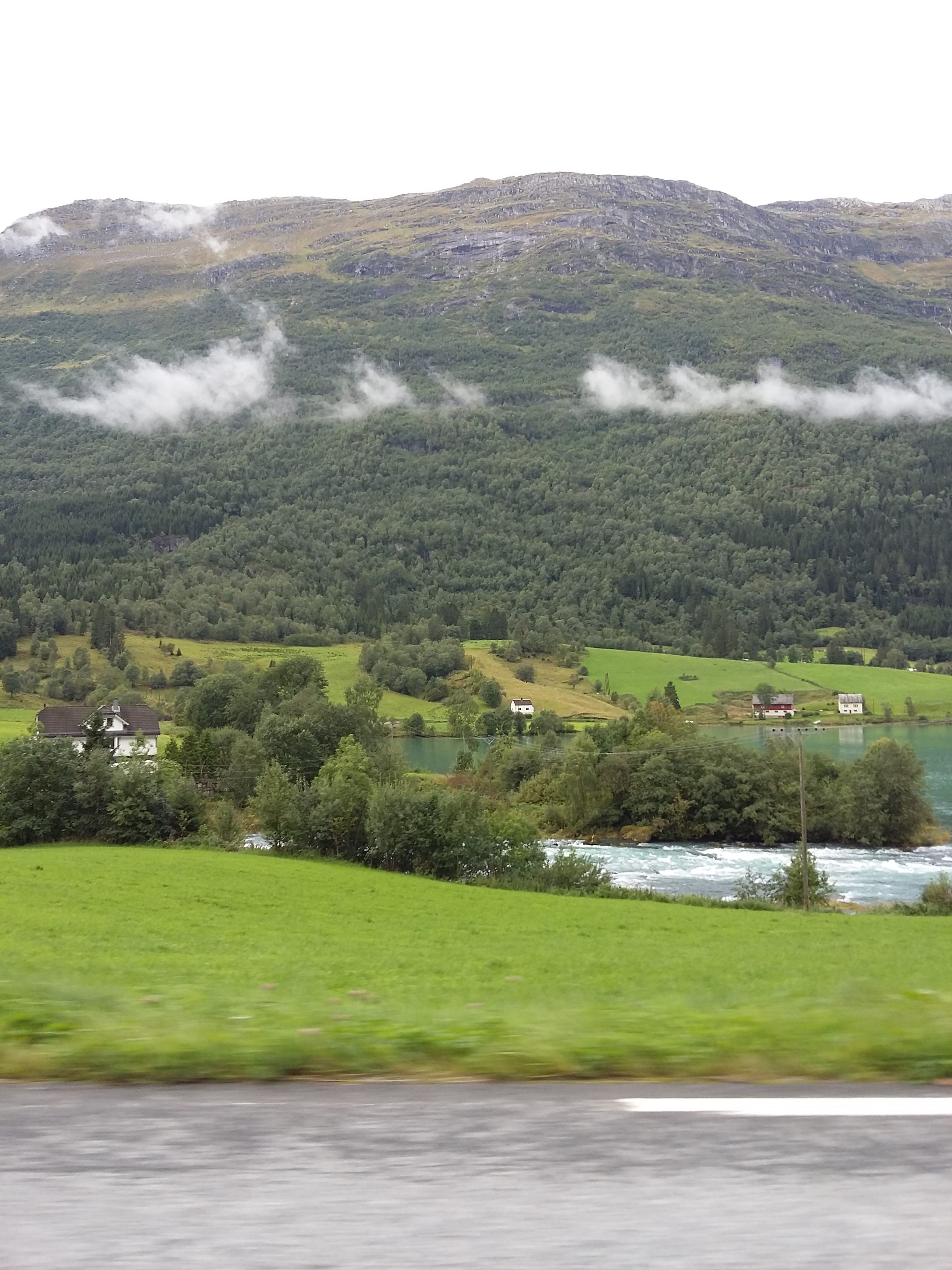 After leaving the ferry the road weaved its’ way through a long valley before turning southwest toward Stryn. We then followed along the northern shore of Innvikfjorden. This stretch is remarkably beautiful. Pulling over into a layby for a break we were treated to dolphins swimming nearby in stunningly blue water, with a cruise liner leaving Olden to give a hint of the scale of the remarkable sights available in Norway.