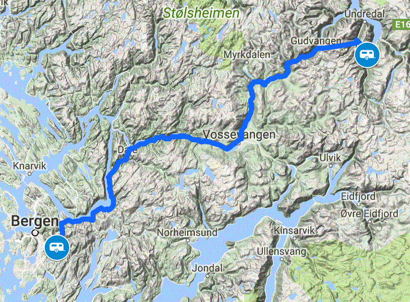 After a casual pack away, we hitched up the caravan and pre-warmed the car engine to start the quite steep 5km climb up to the E16 road. Within a kilometre we entered the first of more than 30 tunnels on the route, the 11km tunnel to Gudvangen at the head of Nærøyfjord. Luckily there is no gephyrophobia * here 🙂