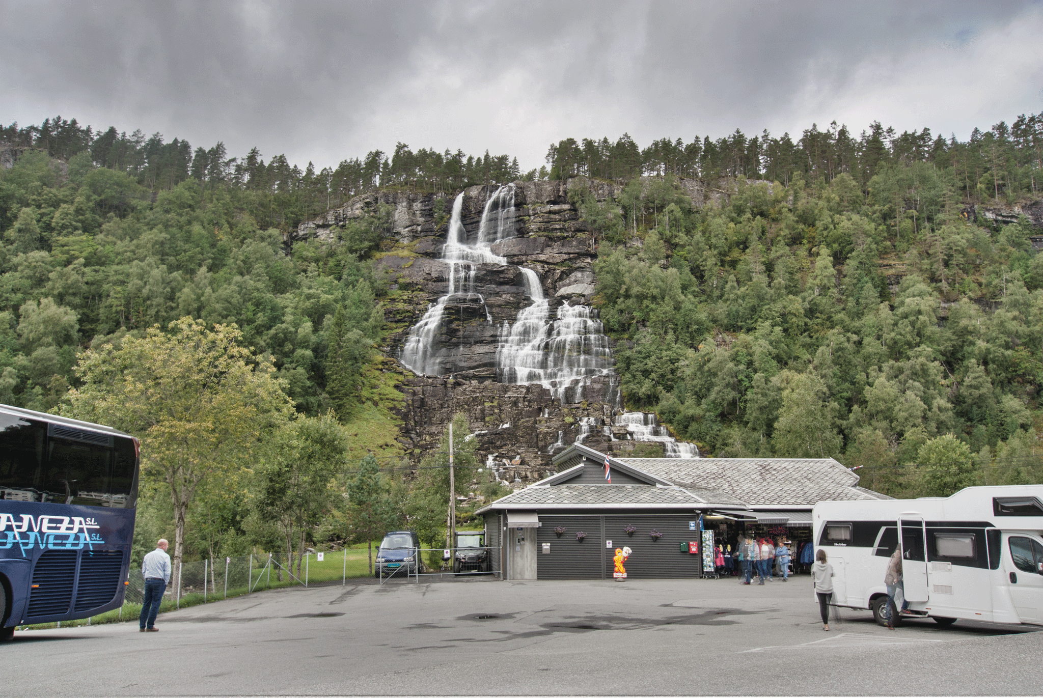 Another 10km or so later we saw a nice looking waterfall with lots of parking space, so, not having had our rushing water fix today, we pulled over to savour the 152 metre high Tvindefossen.