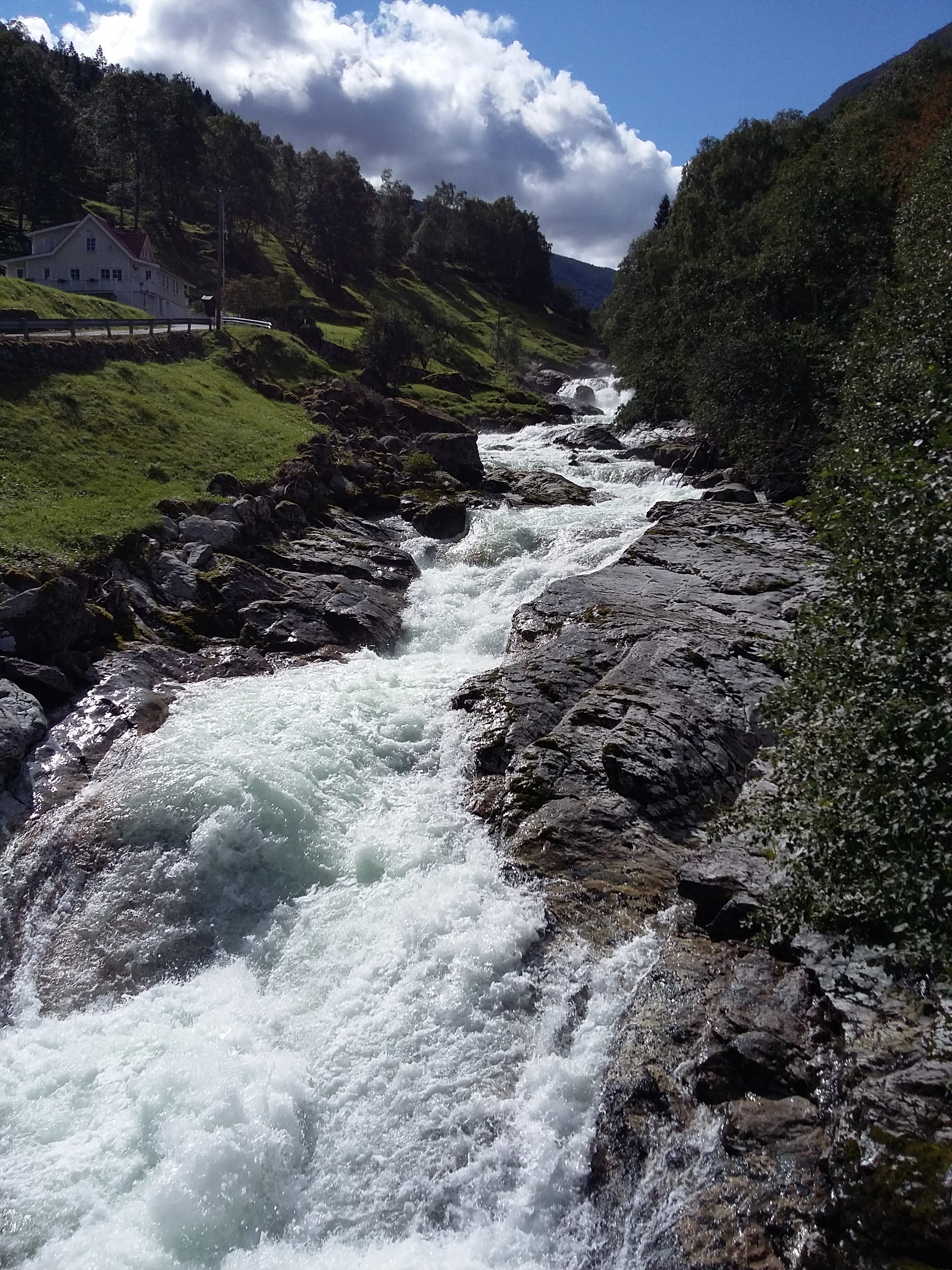 Back in the car the road began to descend through a series of sharp bends between the trees following the Vardhaugselvi river on FV 243, where we passed several cyclists on their way up!