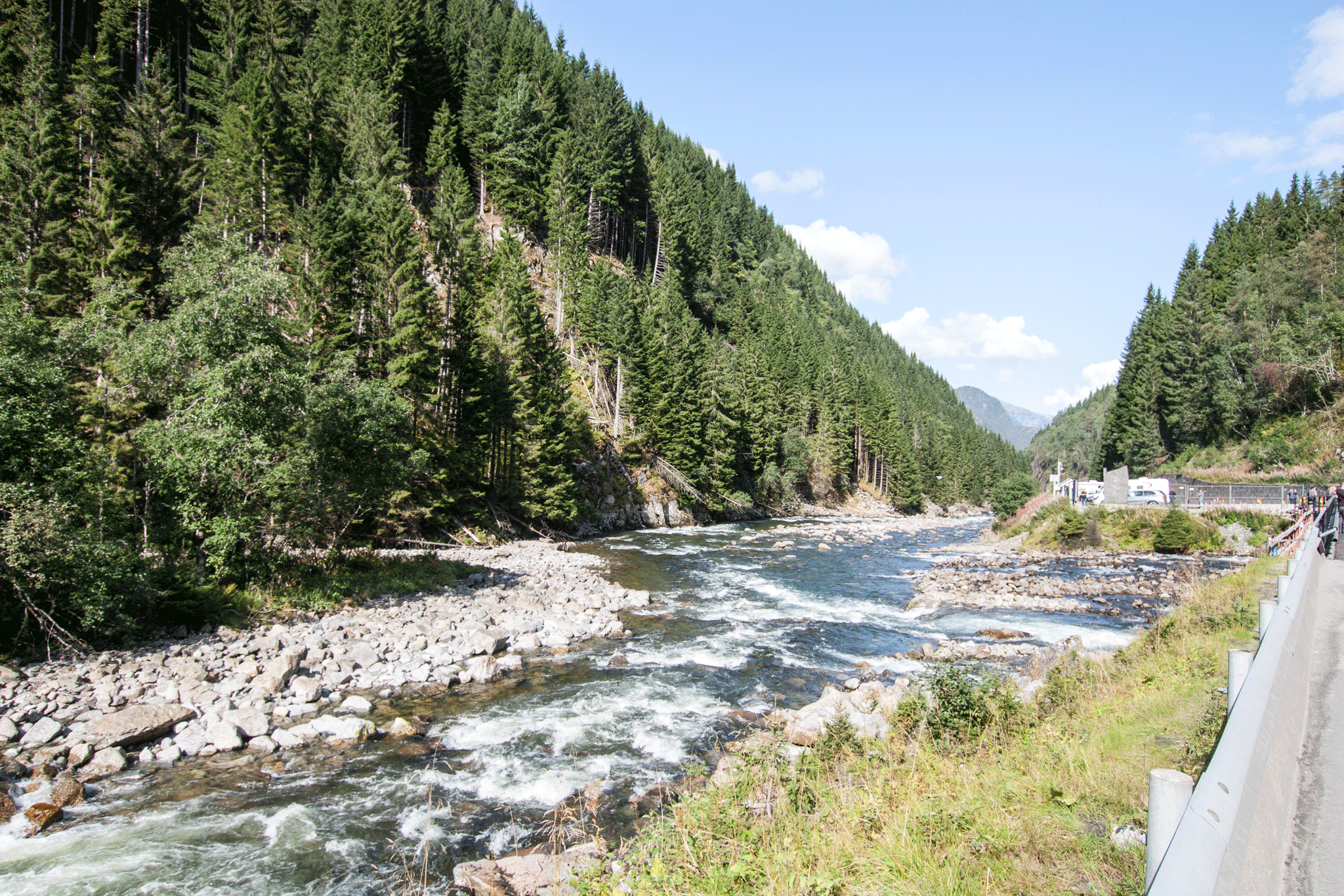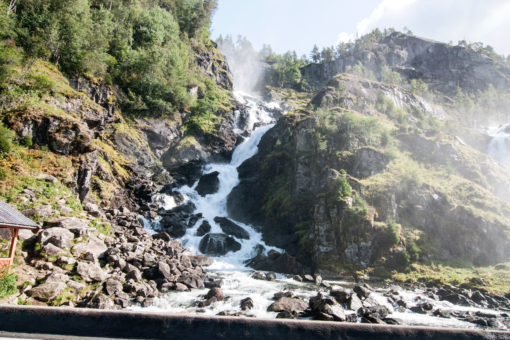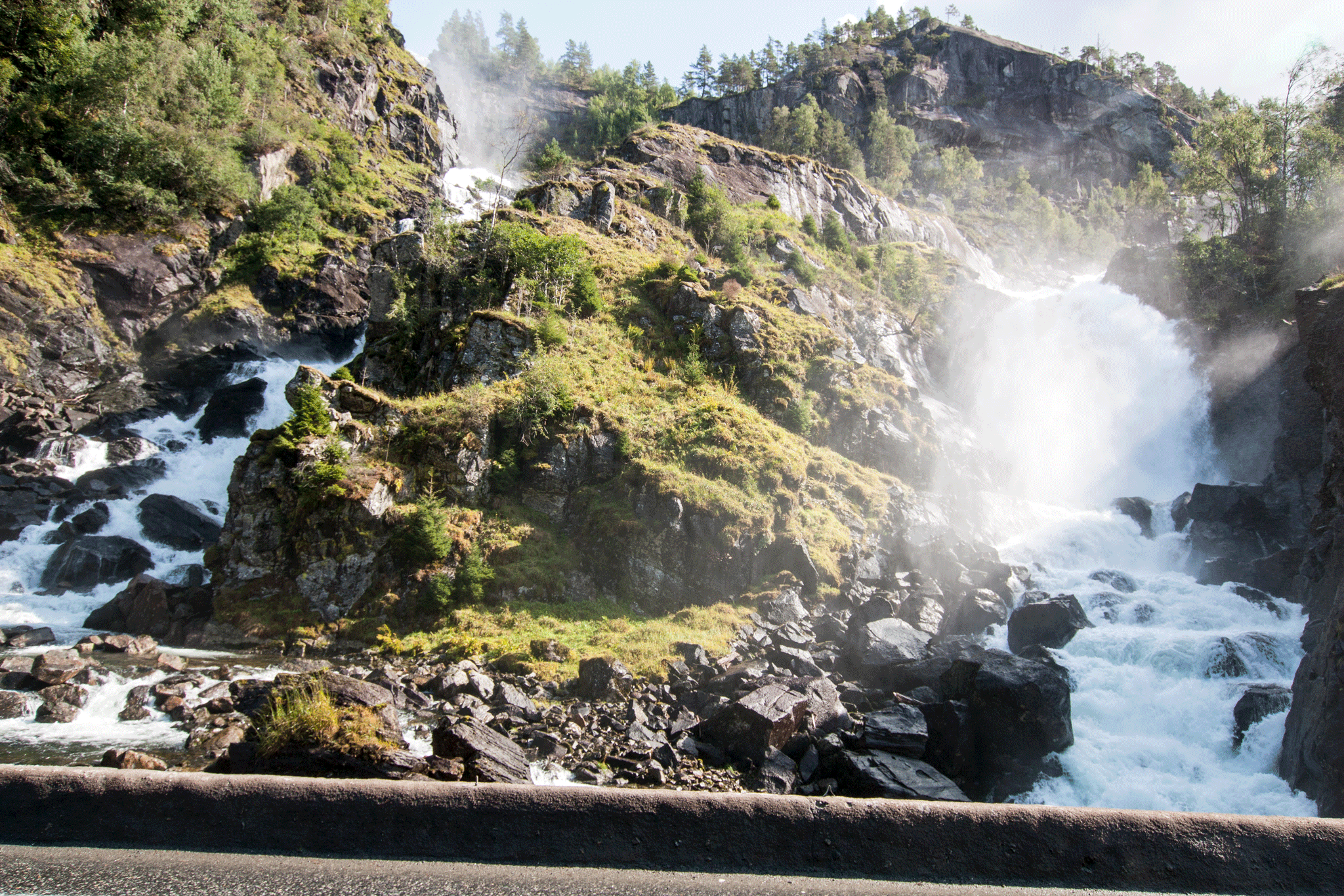 Reaching the end of the fjord at Odda, we then followed the short river Opo on the 13 road up past Sandvinvatnet lake. A couple of kilometres later we came to Låtefossen. This is two waterfalls that join together just short of the 13 road before flowing under it. At times in Spring the spray can be so bad that the police have to operate a one way at a time system to avoid collisions.