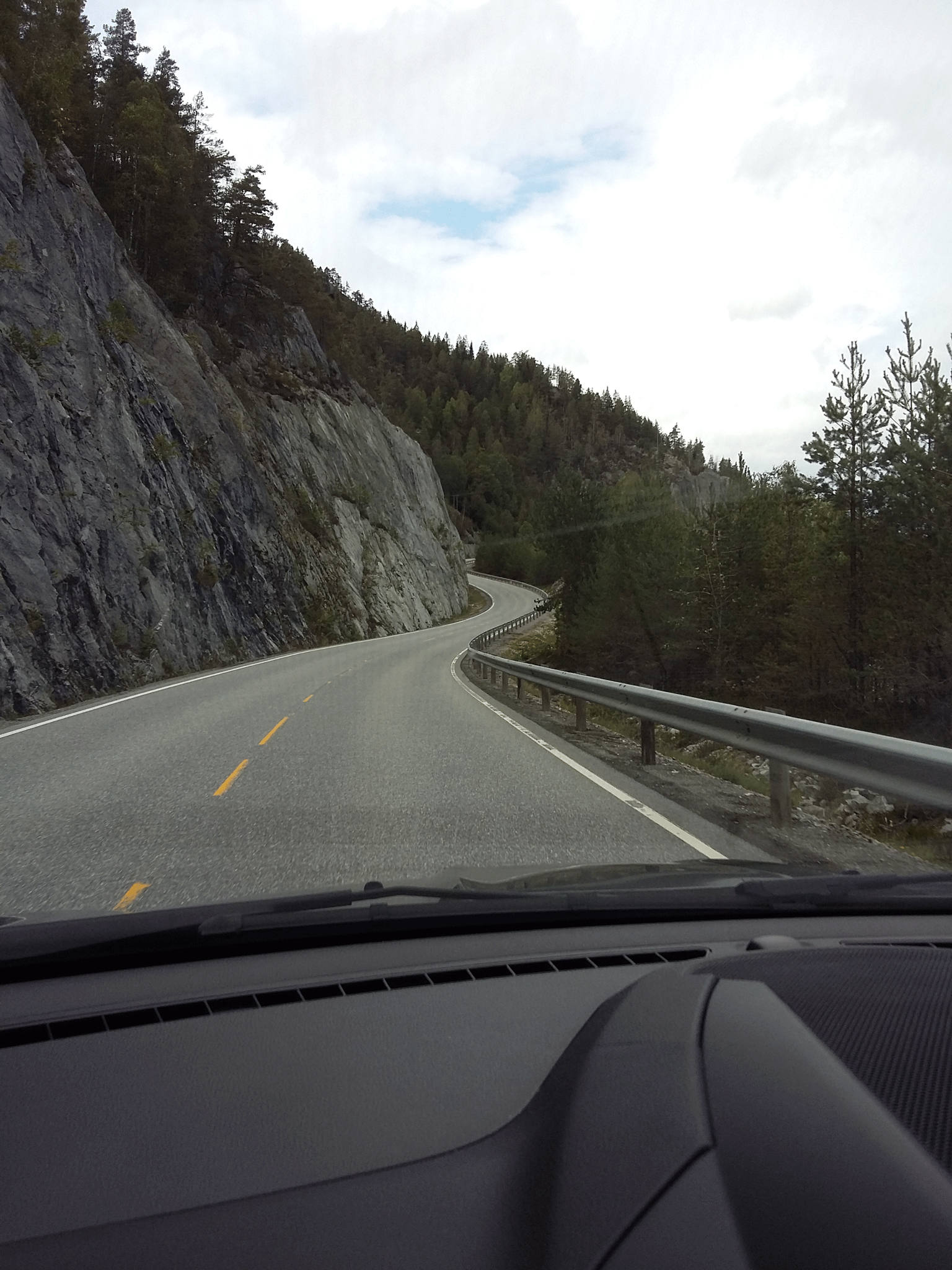 Things improved once we had turned onto the 41 for a while but quickly deteriorated on passing the Nisser lake. The road surface was appalling. I feared for my fillings let alone the caravan and contents. Progress slowed to a crawl with frequent pulling over to let traffic past. I doubt we averaged 30km/hr for half an hour.
