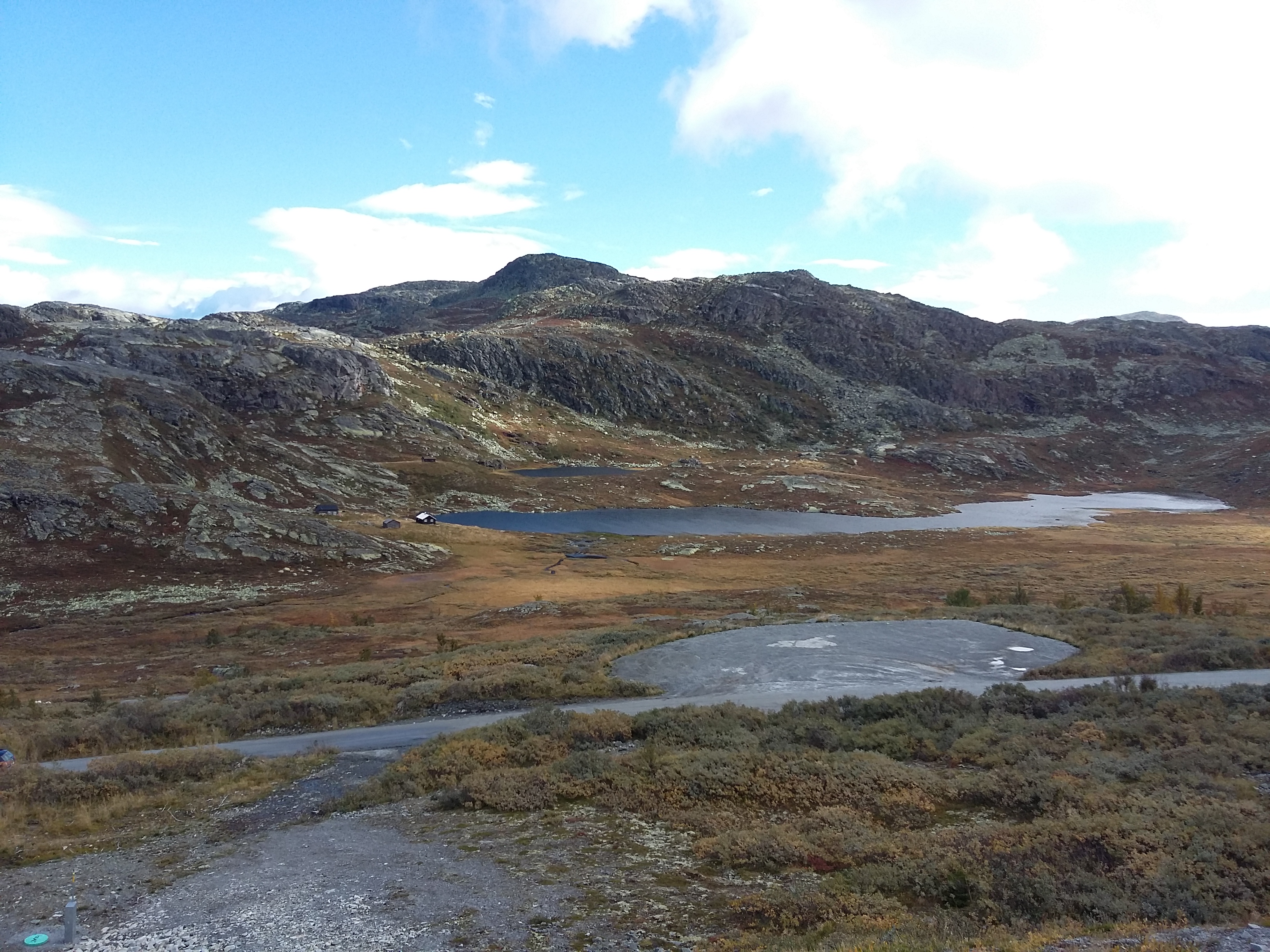 13 kilometres from our campsite was the small car park at the entrance to the Gaustabanen. As always we love an interesting road, especially if we are not towing and after turning off the main 37 road we were not disappointed by the zig-zag climb up the Svineroivegen, FV 651. We also spotted the remains of chalk marks on the road from the recent Norsemen Xtreme Triathlon.