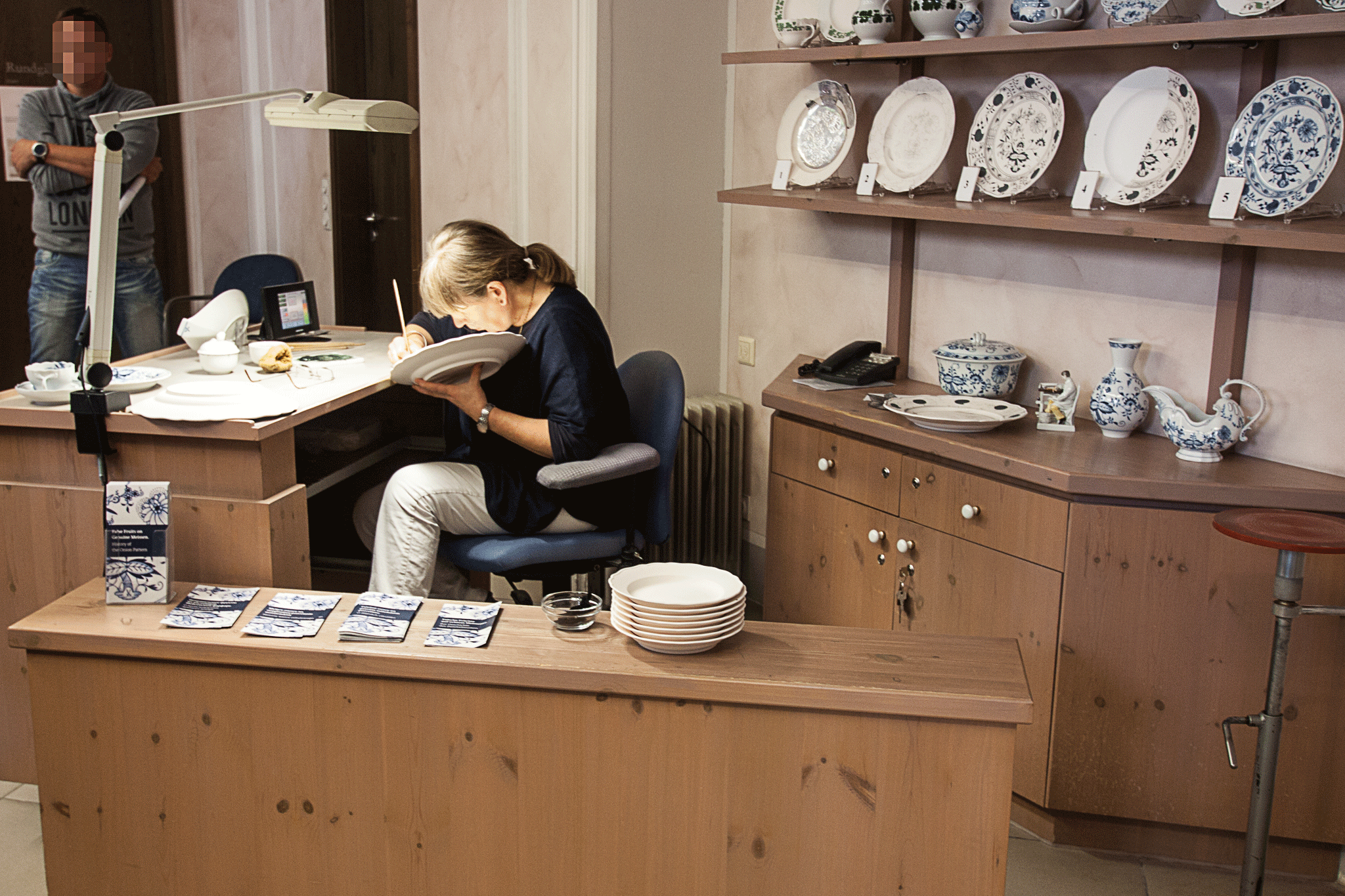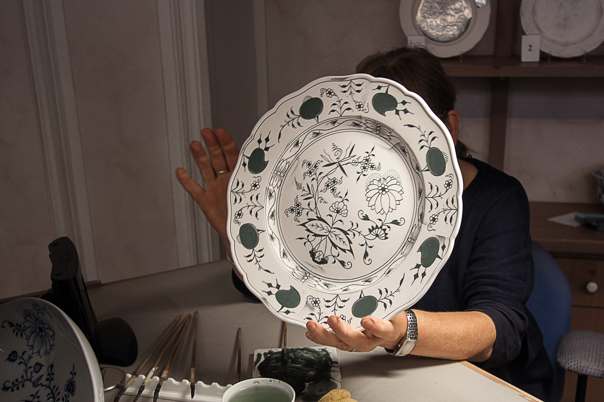 Next stage of the tour showed the pre-firing decoration of a plate. The various stages of the process are shown on the shelves behind and the commentary refers to these as the lady paints with deft strokes of the brush.