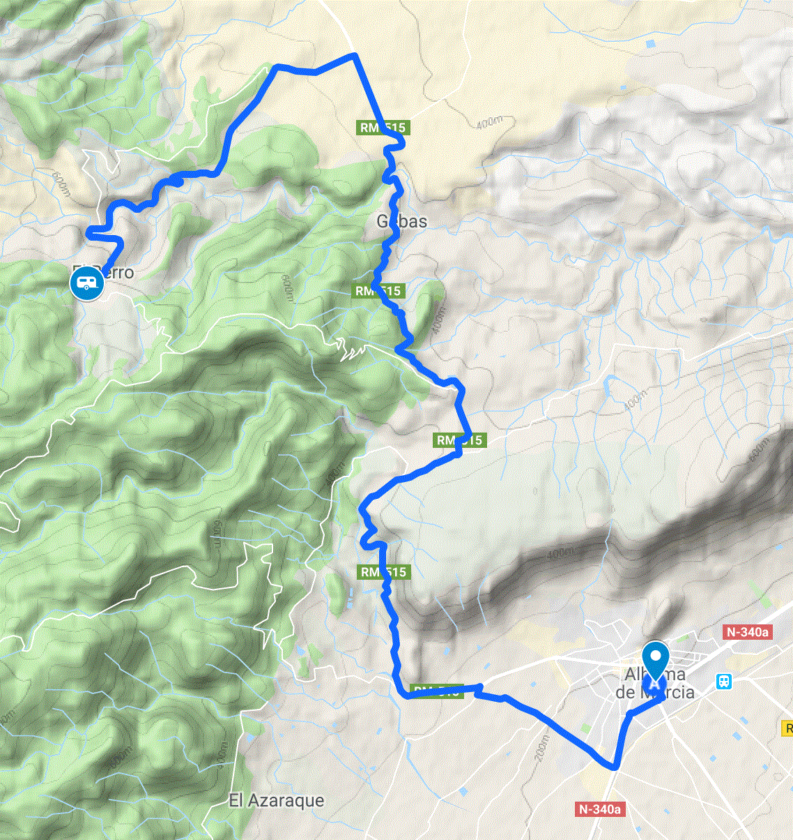Back on the road, and the journey continued nicely until we approached Alhama de Murcia to begin the rather convoluted climb up to the site at El Berro. Road closures for Easter festivities called for a diversion through rather narrow roads before we got back on track.