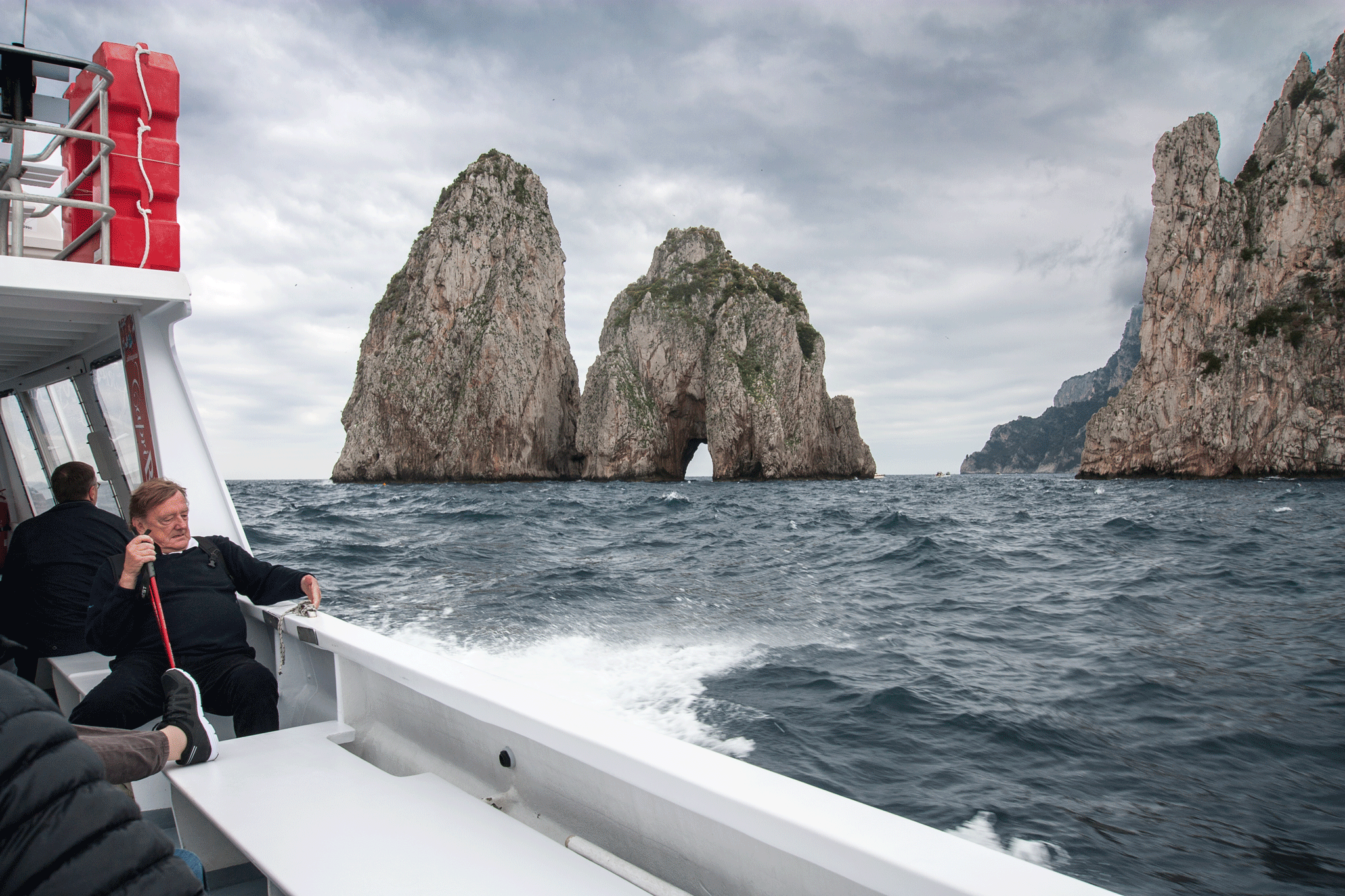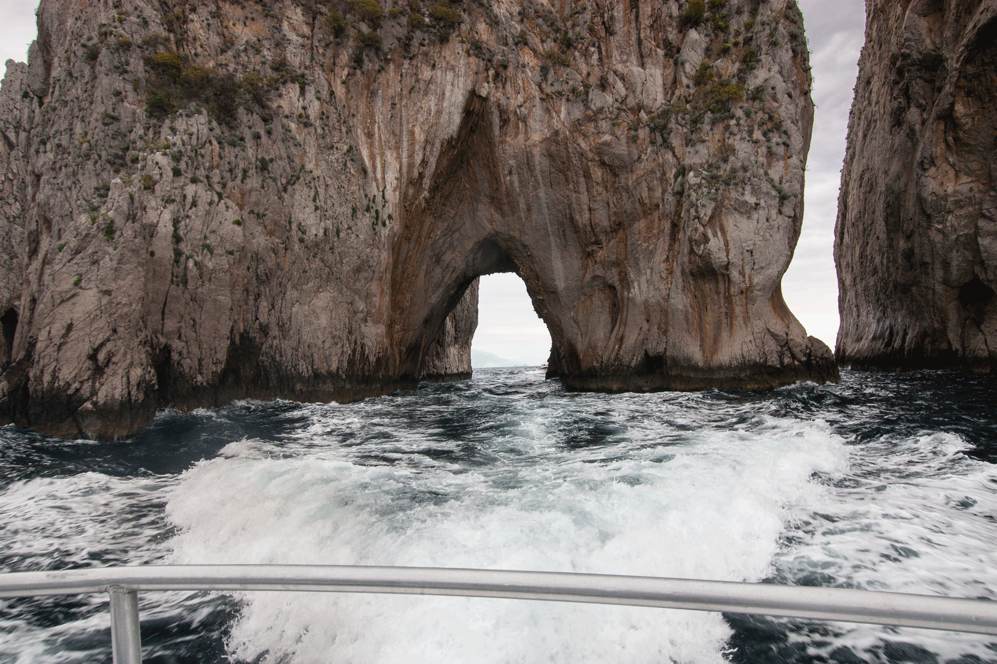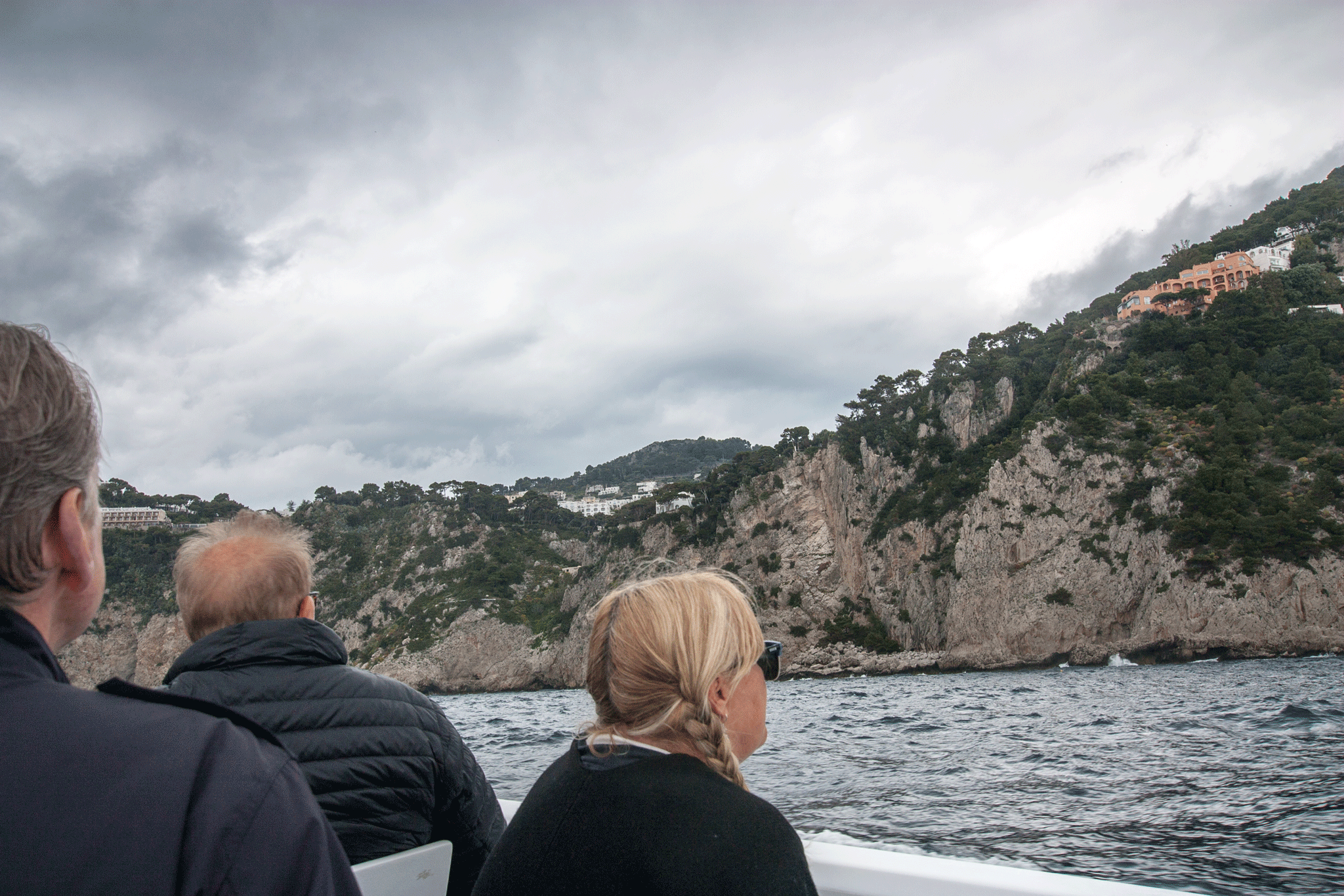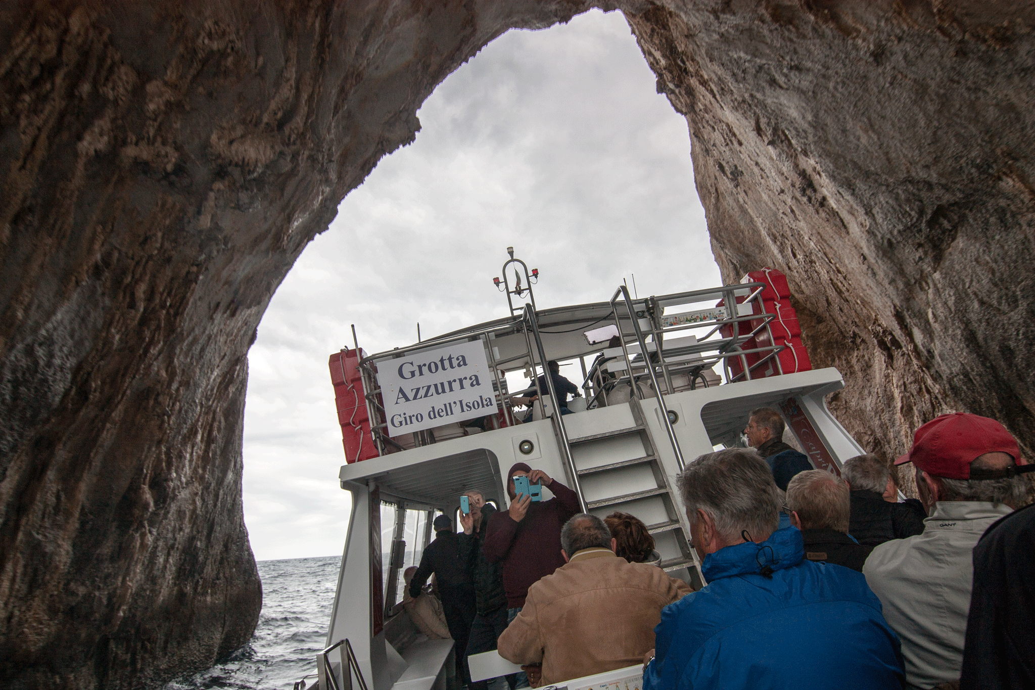The skies were very dark and the water very choppy at times. I wondered how Kim would hold up for the hour trip but the time passed without incident 🙂 Our guide was on the bridge and took the microphone to keep us informed about the parts of the island we were seeing, but a lot of her commentary was lost in engine & wind noise. The captain showed great boat handling skills as he took us into a sea cave and through one of the rock arches while the boat was tossed about by the waves.