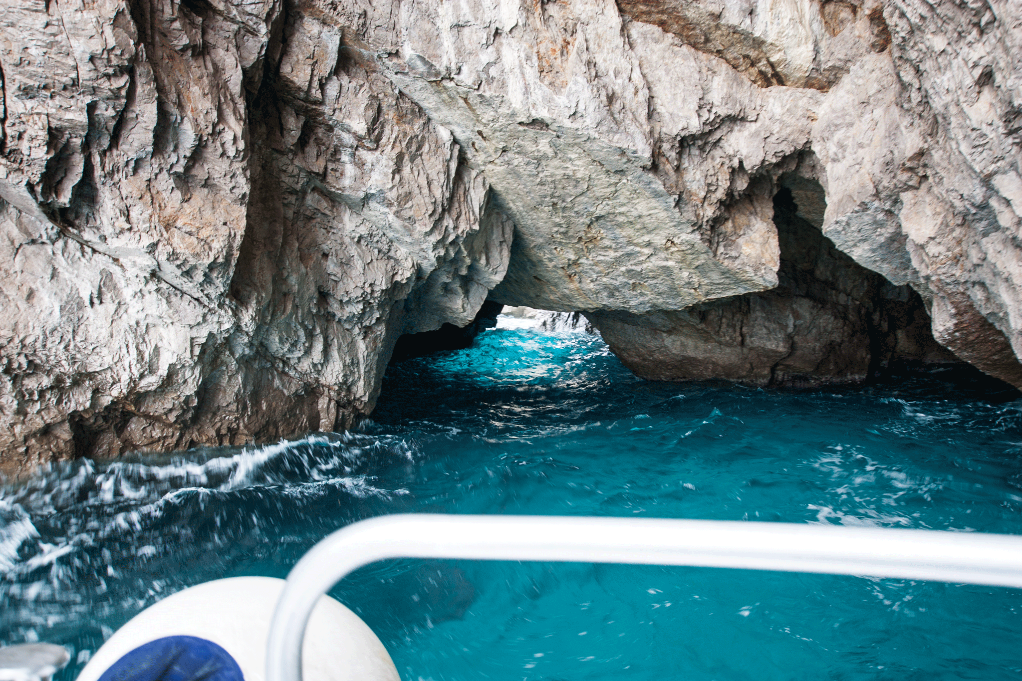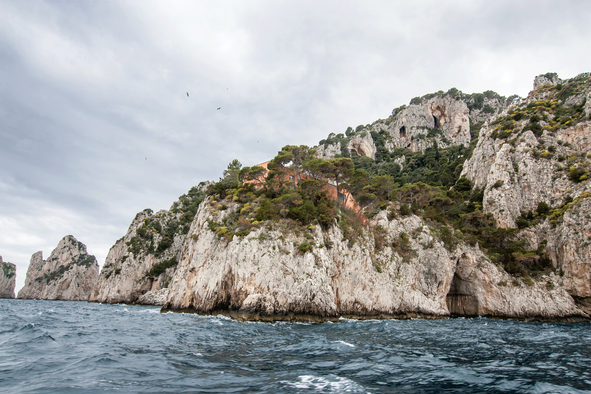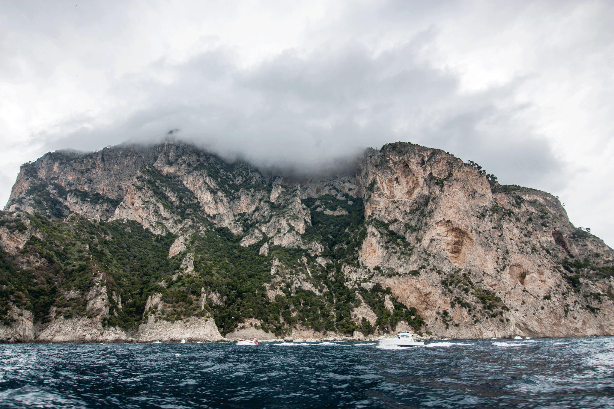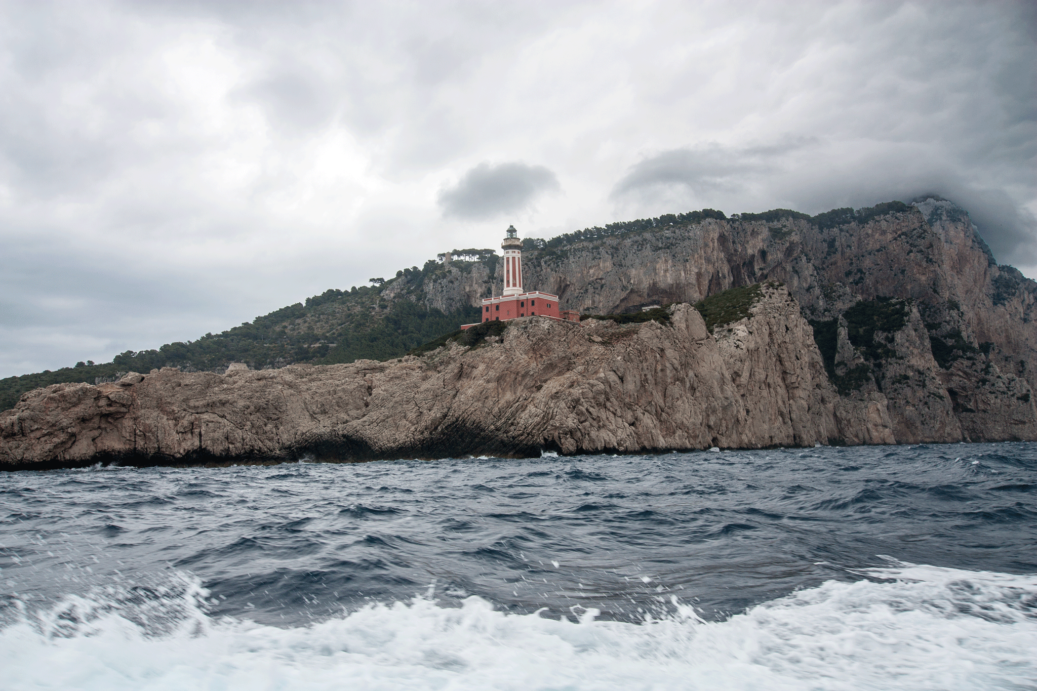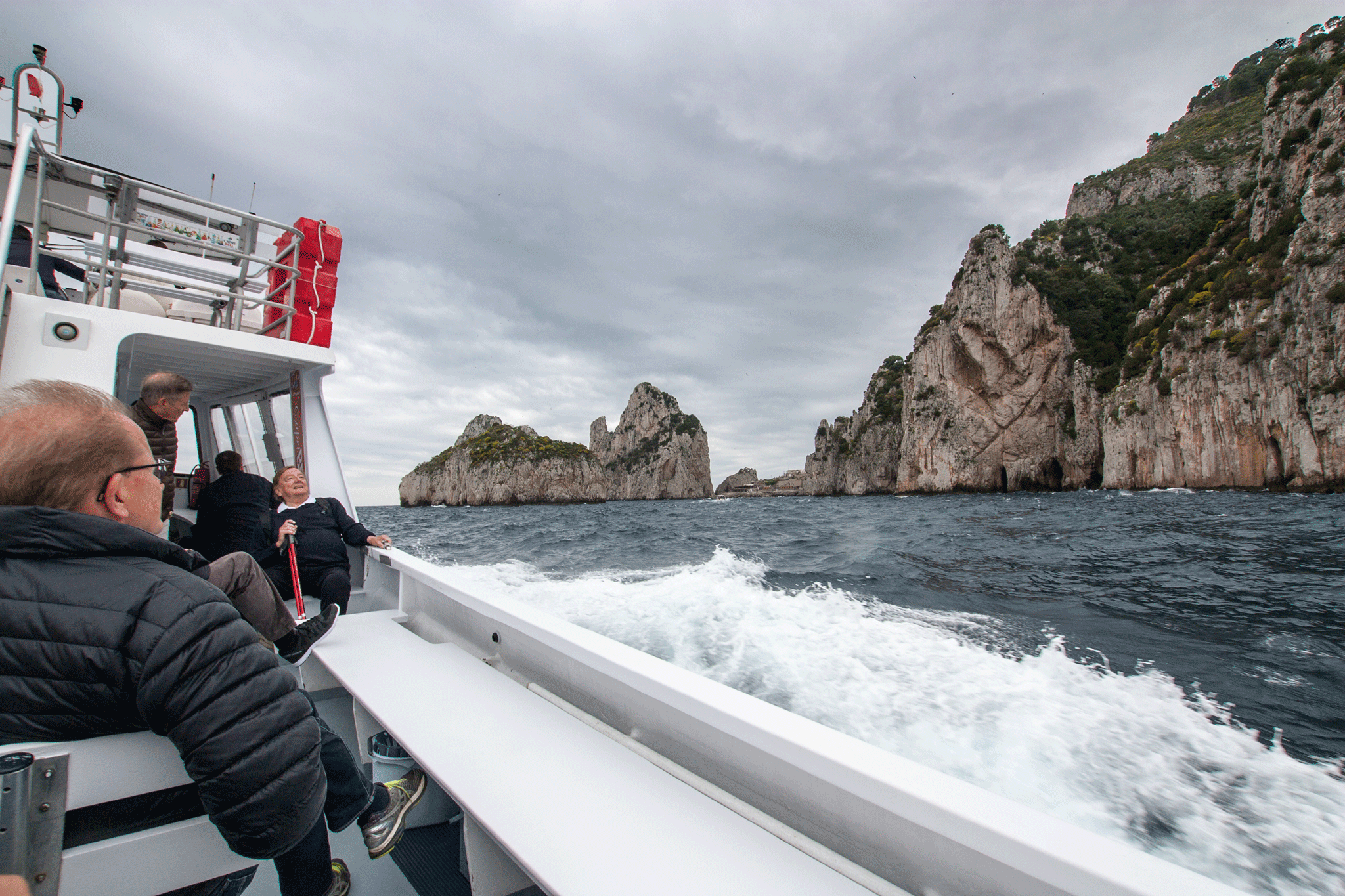 The skies were very dark and the water very choppy at times. I wondered how Kim would hold up for the hour trip but the time passed without incident 🙂 Our guide was on the bridge and took the microphone to keep us informed about the parts of the island we were seeing, but a lot of her commentary was lost in engine & wind noise. The captain showed great boat handling skills as he took us into a sea cave and through one of the rock arches while the boat was tossed about by the waves.