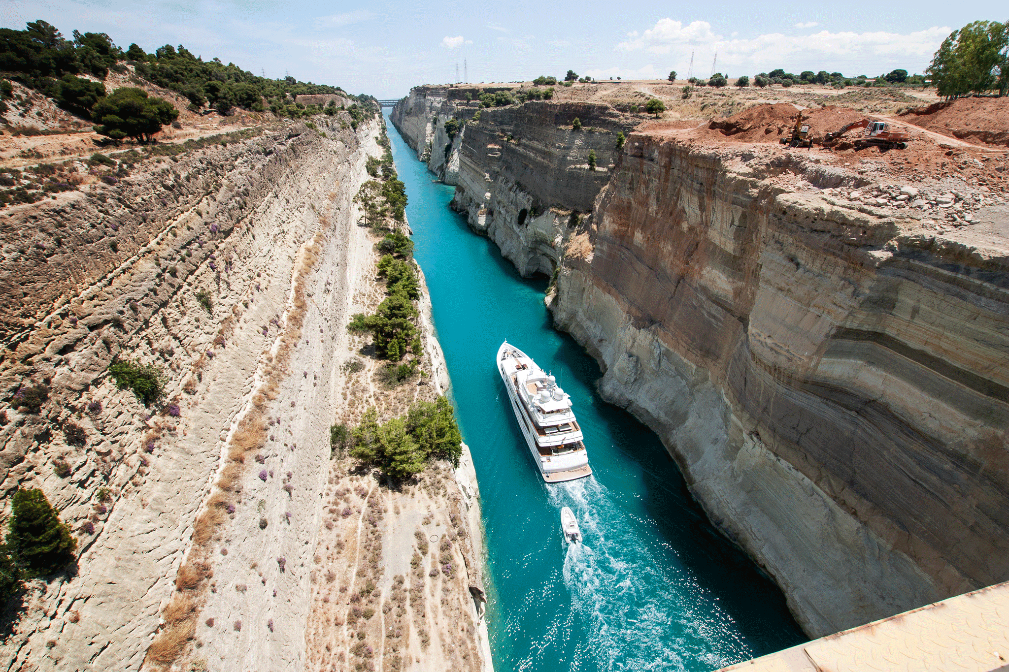 Consisting of a single channel 8 metres deep, 21 metres wide, and 6.3km long, the Corinth Canal joins the Gulf Of Corinth with the Saronic Gulf in the Aegean Sea. The near vertical walls rise 90 metres above sea level each side.