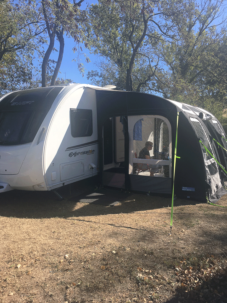 Good progress was made on the autoroute. Then, within 15 miles of the site, my sat nav guided me down the most unsuitable of roads on which to tow a caravan. A few hairy miles followed with a suitable amount of cursing on my part. On arrival we were given a warm welcome by Hèlène & Myriam. In glorious weather, we set up with the caravan windows open for a change & put up the awning without the prospect of it getting wet. As I write we have been here 6 days and the temperature in the afternoon has been above 22 degrees every day, and no rain at all. What a change from Wales & Ireland!