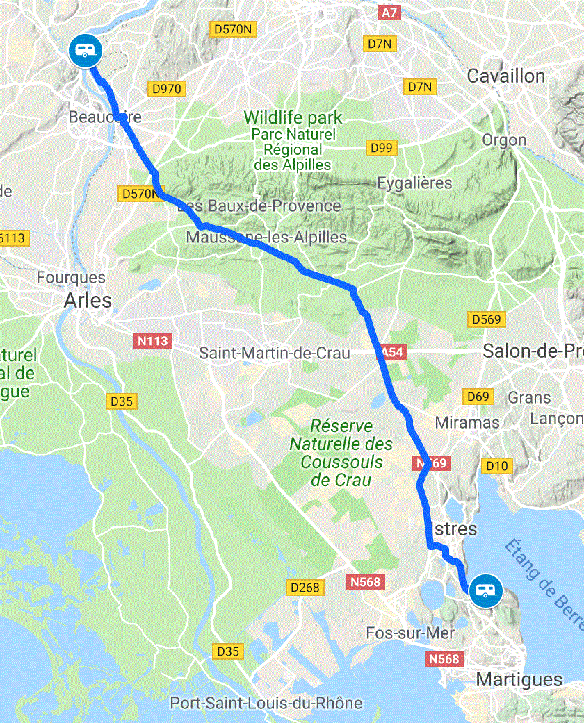 Today the plan was simple, to move on from the Campsite Lou Vincen in Vallabrègues to Campsite Le Neptune in Saint-Mitres-Les-Ramparts. This is another Camping Card Site and is  €15 a night and was chosen as a base to visit Marseille. It is a trip of 61km, easy.