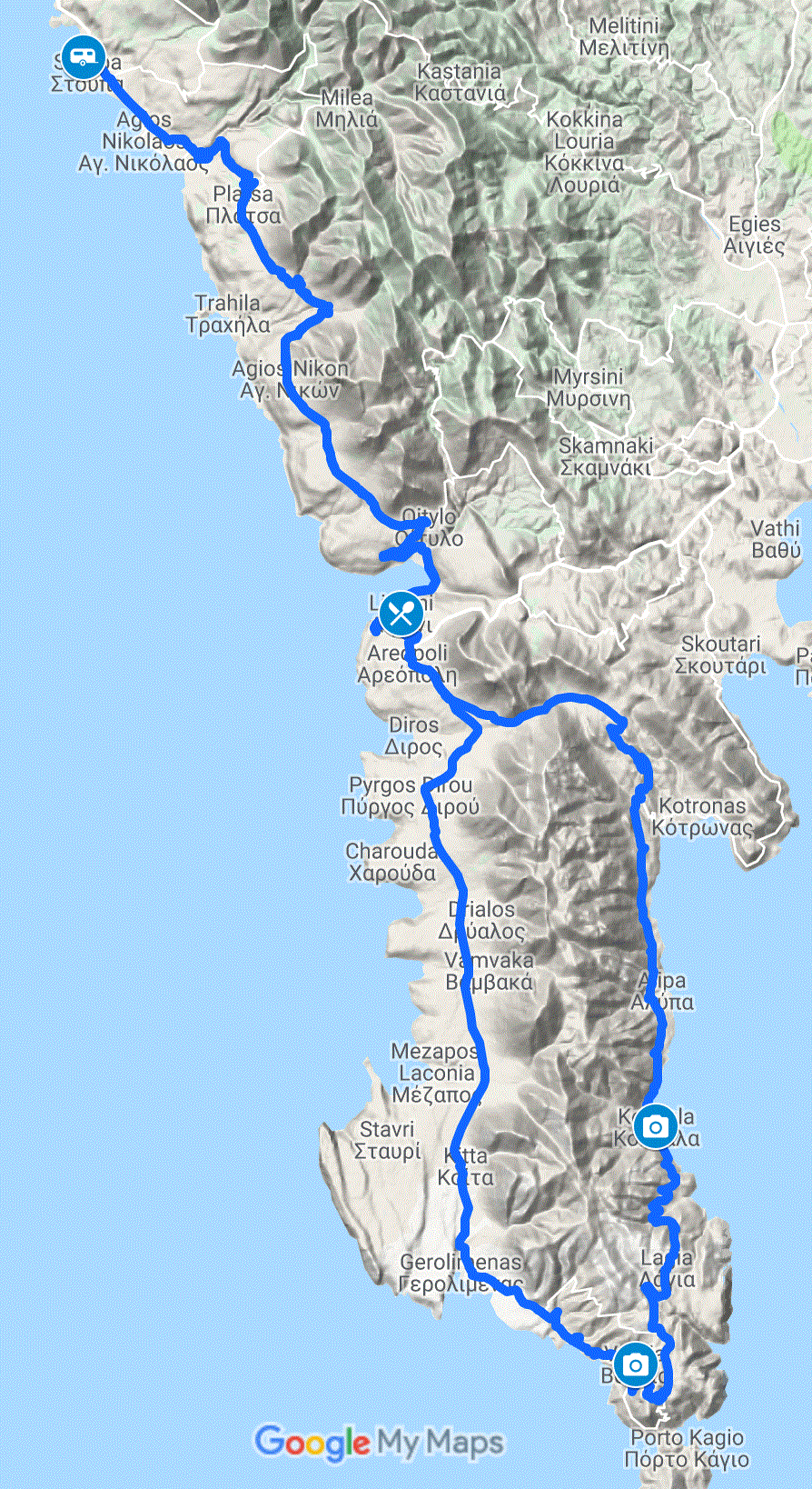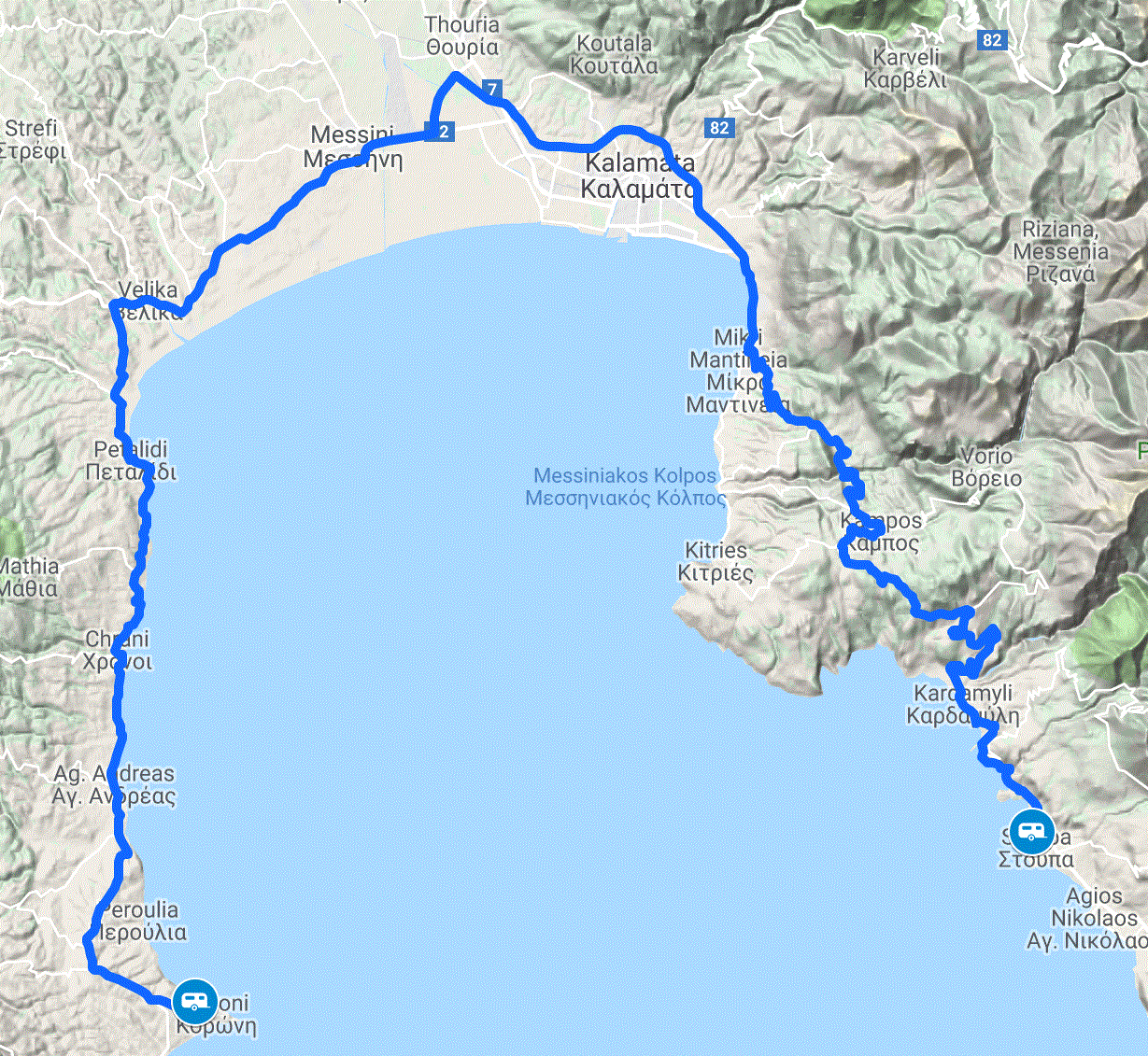 The planned route took us north on the same roads as we had taken to Messena, then east around Kalamata before joining the new 7 road south toward Stoupa.
