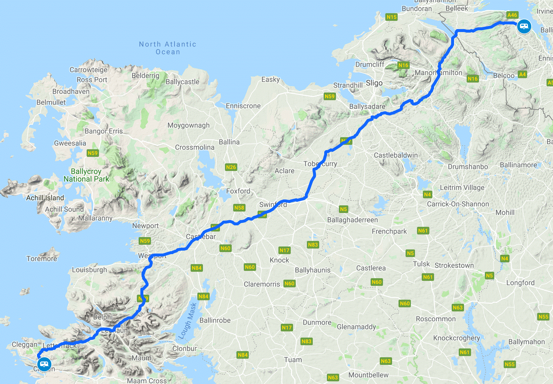 We travelled the whole length of the Harbour, skirting the southern shore, passing through the village of Leenane before crossing into County Mayo, from Galway. The road followed the meandering Erriff River at the base of the mountains, with views of water cascading down the slopes. We continued on N59 to Westport, then headed east to Charlestown and the border between County Mayo and Sligo.