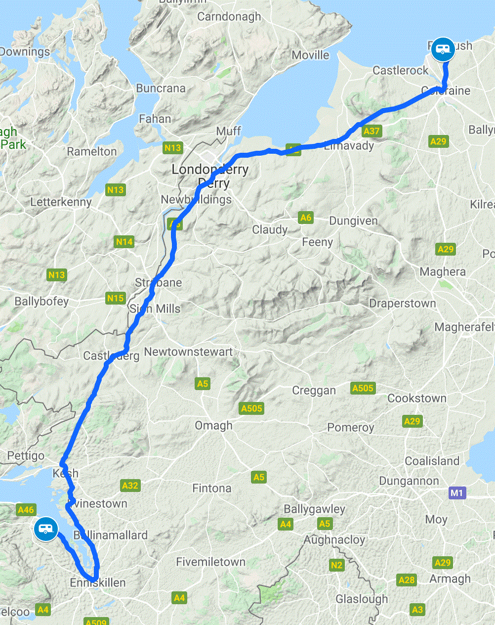 Sat Nav mistake #2 was just around the corner. Instead of taking the longer route B52 to Belleek and then the lovely smooth A46 to our destination. Oh no, we headed east on the scenic Ulster Way! Not so scenic towing a caravan or if you suffer from motion sickness. The road was suitable for tractors and that’s all that we encountered on our 9.7 miles to A46! Needless to say, by the time we reached the end, we were both feeling the worse for wear.