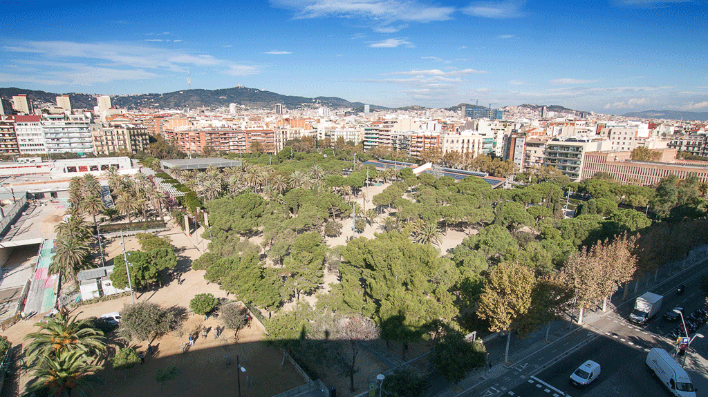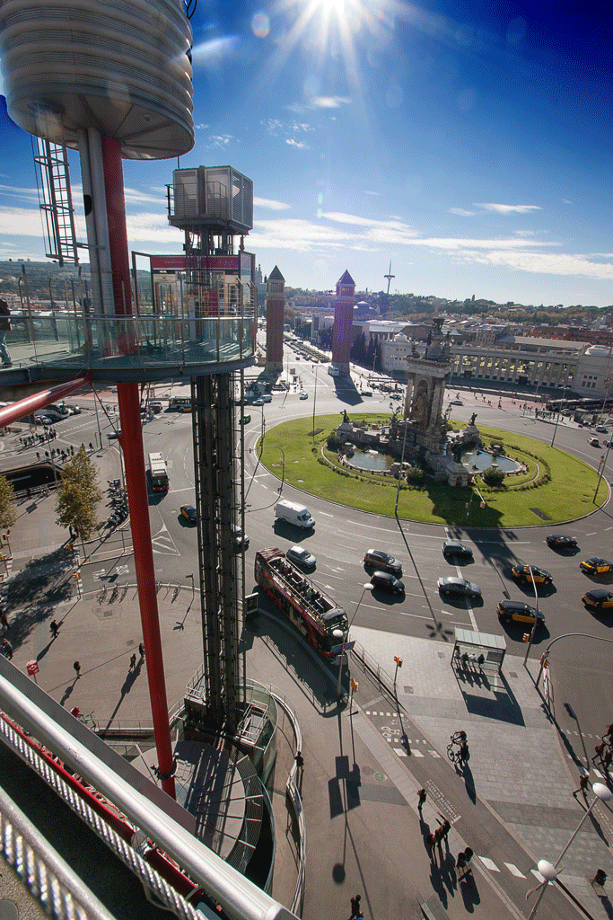 The circular rooftop enables you to enjoy panoramic views of the Plaça, including the Parc de Joan Miró, with it’s Woman and Bird Sculpture. (Unfortunately we didn’t get a photo of the sculpture to the left, only the park).