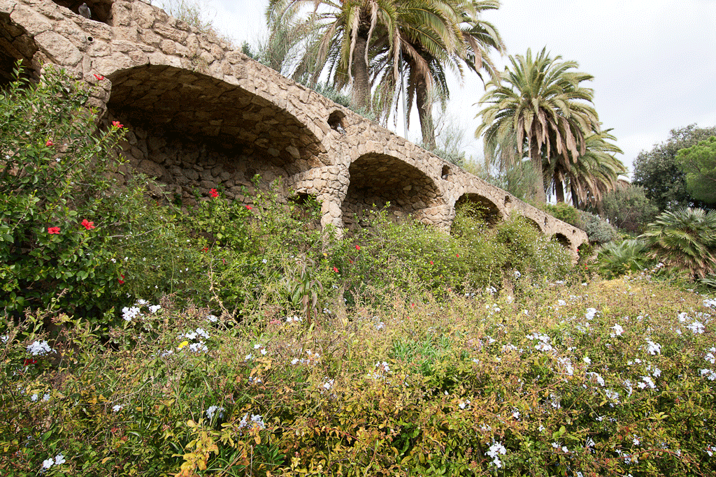 On passing through an original iron gate, we reached the gardens of the former farmhouse, the Casa Larrard and a portico backing onto the retaining wall of the upper roadway. It is made from rough stone and resembles a huge wave.