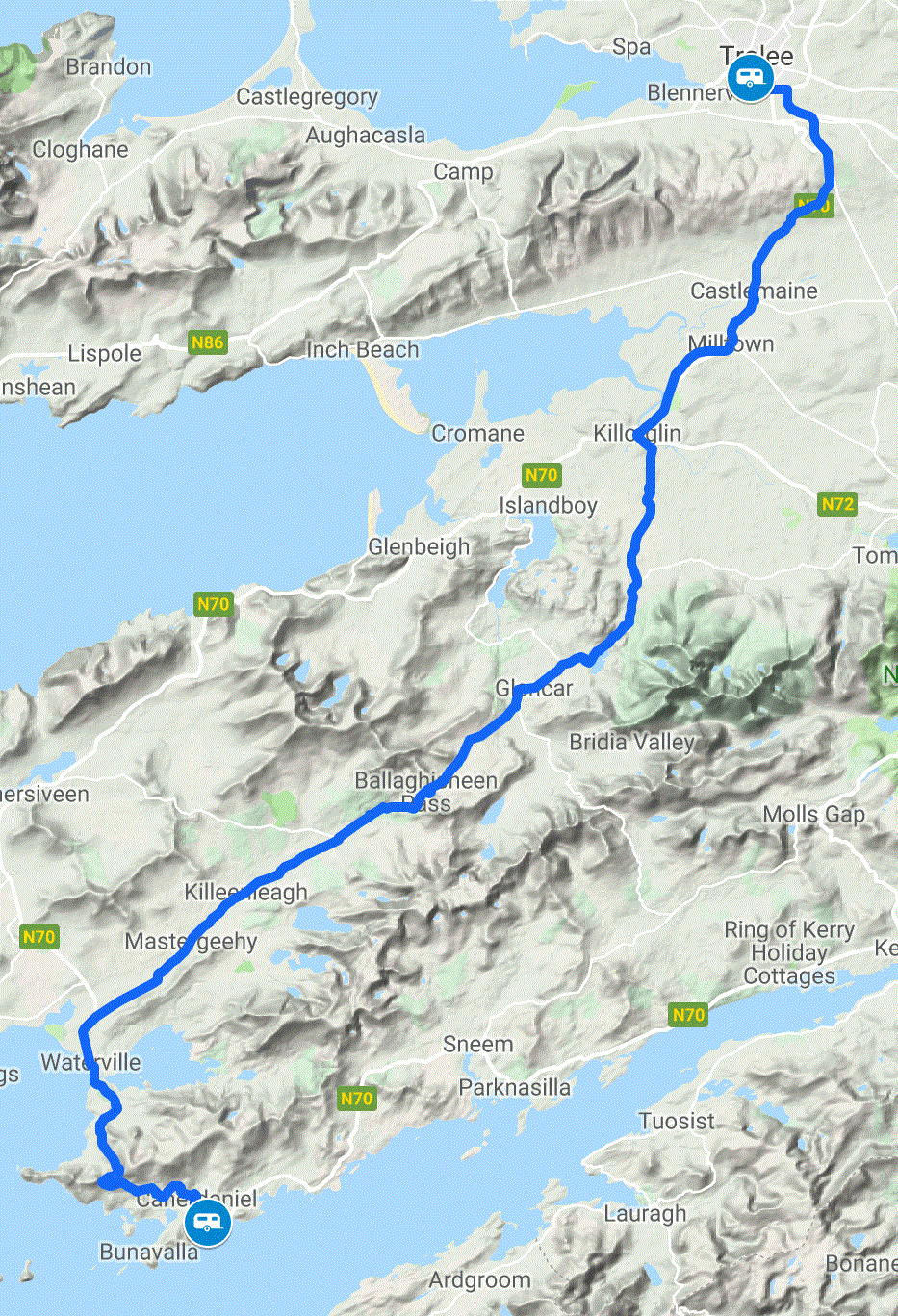 After our wash out yesterday we decided to pack up and make our way onward to Tralee (home of the Rose of Tralee), to complete the Ring of Kerry.